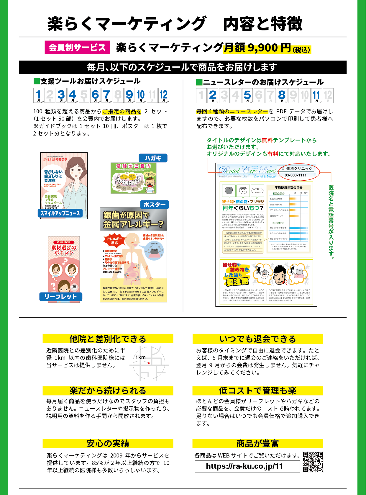 会員制の院内マーケティングサービス”楽らくマーケティング”は2009年からサービスを開始し、会員様のご要望に応えてまいりました。説明の充実と質の向上を目的としたリーフレット、医院の強みやワンランク上の治療の紹介を目的とした情報誌スマイルアップニュース、相談などのキッカケをつくるポスター、休眠患者対策としてのリコールハガキなど、商品の種類も内容も充実し院内の様々なシーンでご活用いただけるサービスになりました。